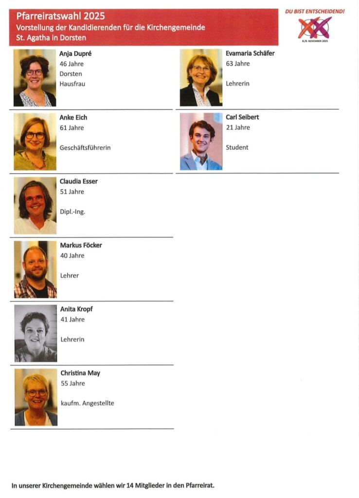 Die Wahl ist am Sonntag, 9. November um 12 Uhr NUR im Rahmen einer Pfarrversammlung in der Kirche St. Agatha, hierzu laden wir herzlich ein. Wählen darf man bereits ab 14 Jahren. Gemeinde lebt vom Miteinander – jede Stimme zählt.