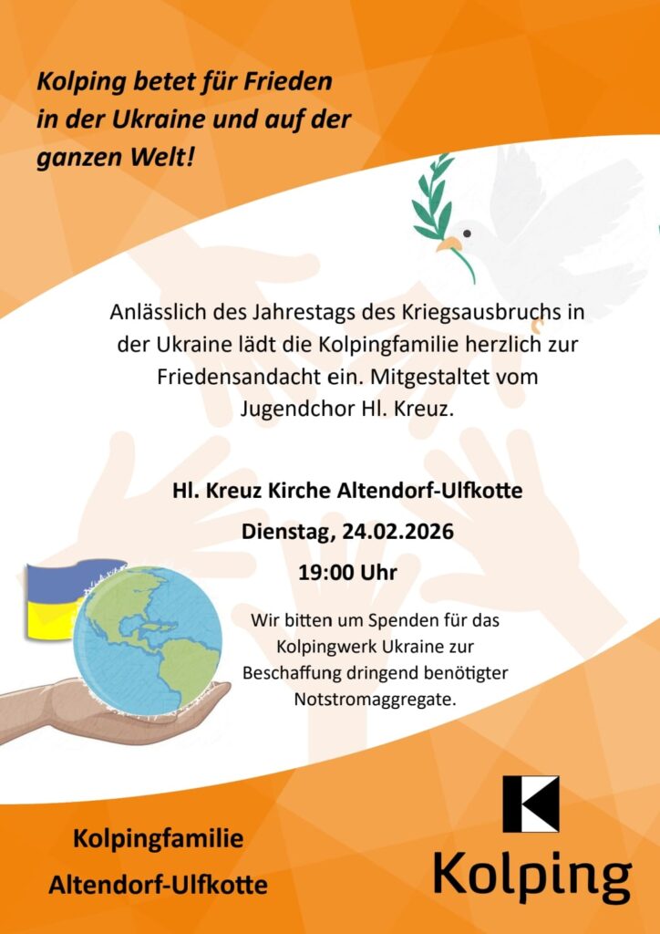 Wir laden ein zum Gebet für den Frieden am Dienstag, 24. Februar 2026 um 19 Uhr in der Kirche Heilig Kreuz . Unfassbare 4 Jahre dauert dieser Angriffskrieg bereits. Es wird am Ausgang um Spenden für das Kolpingwerk Ukraine gebeten, um dringend benötigte Notstromaggregate anschaffen zu könnenAlles Weitere findet Ihr auf dem Plakat .