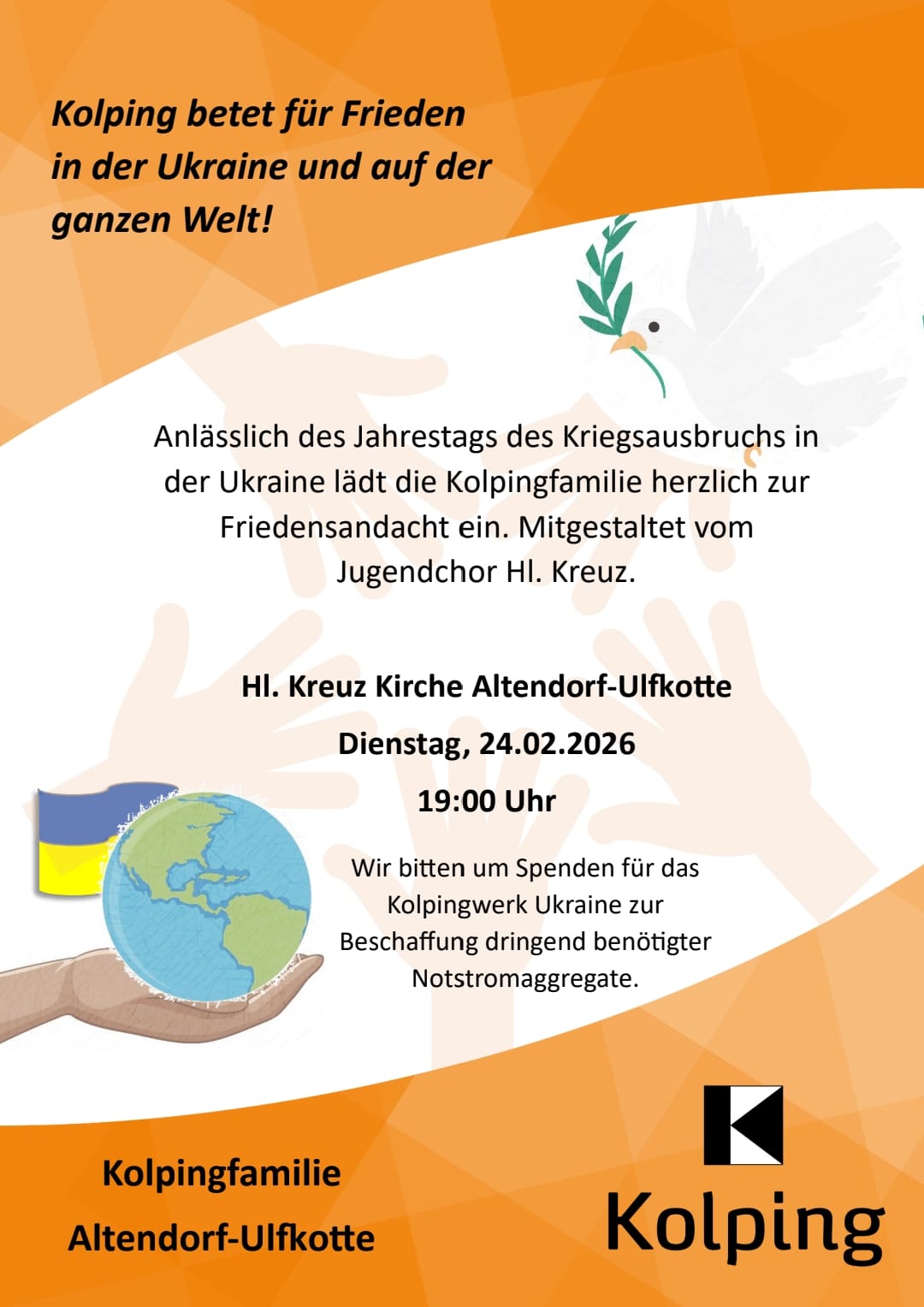 Wir laden ein zum Gebet für den Frieden am Dienstag, 24. Februar 2026 um 19 Uhr in der Kirche Heilig Kreuz . Unfassbare 4 Jahre dauert dieser Angriffskrieg bereits.