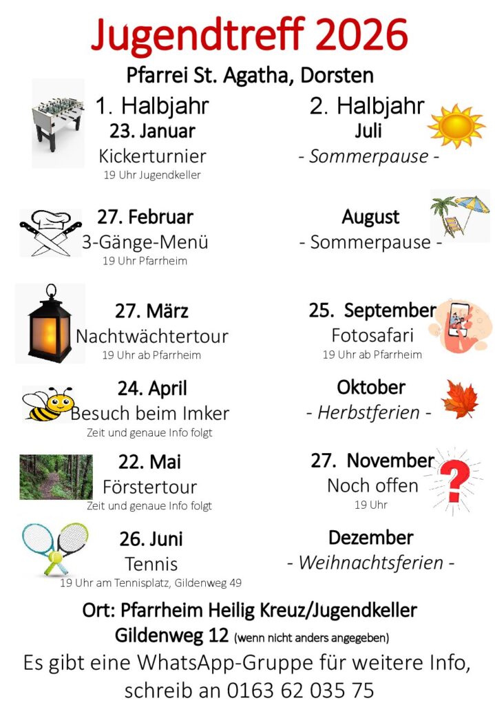 Unser Jugendtreff richtet sich an Jugendliche von Klasse 5 bis 7 und findet jeweils am 4. Freitag im Monat in der Regel im Jugendkeller unseres Pfarrheims Hl. Kreuz in Altendorf-Ulfkotte, Gildenweg 12 statt.